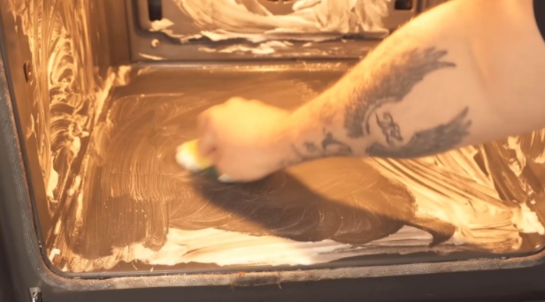 ქაფი დაიტანეთ ხელზე და თანაბრად შეაზილეთ ღუმელის ზედაპირზე. სამოქმედოდ დატოვეთ 15 წუთი. შემდეგ გაწმინდეთ მსუბუქად დატენიანებული ღრუბლით. თქვენი ღუმელი სისუფთავისგან იბრწყინებს.